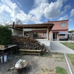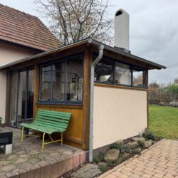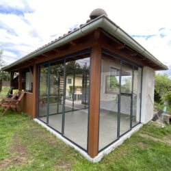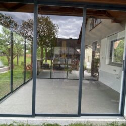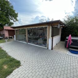 Zasklení do klasické dřevěné pergoly s nízkou střechou. Zákazník si přál možnost uzavření prostoru proti větru i dešti a zároveň volné větrání v létě. Zvoleno bylo rámové zasklení v antracitové barvě RAL 7016, sklo ESG 5 mm čiré.