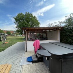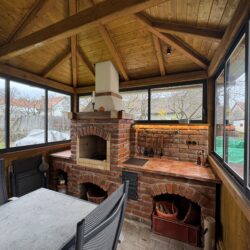 Komentář: Díky zasklení lze prostor využívat po většinu roku. Kuchyň zůstává suchá i při silnějším větru či dešti. Vhodné řešení pro milovníky vaření venku.