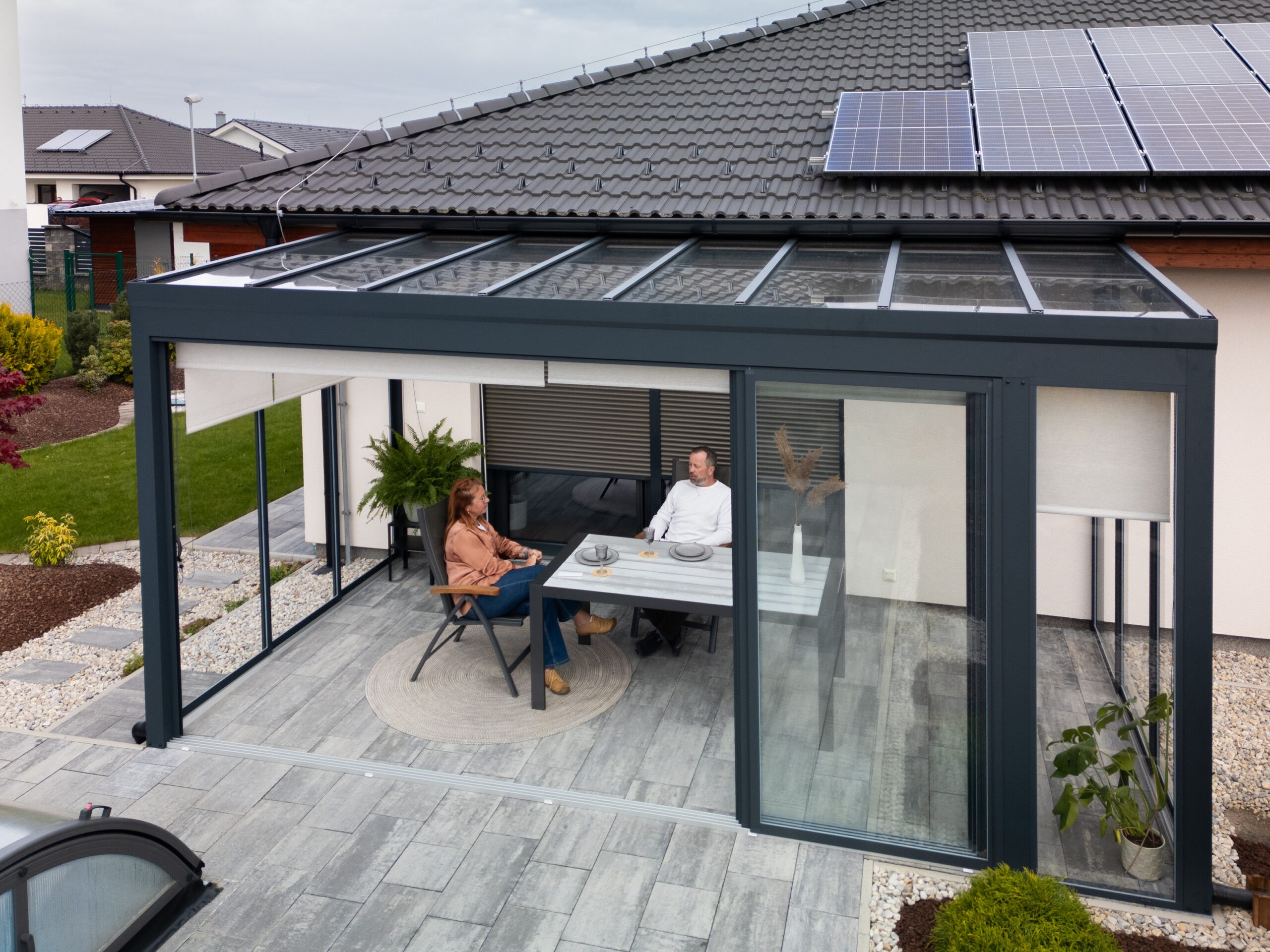 - Zasklení a stínění – posuvné sklo, možnost zastínění dle potřeby – střecha i boky.