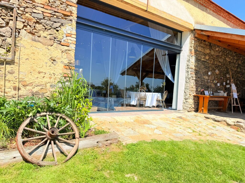 Do svatebního prostoru ve stylu stodoly, jsme instalovali bezrámový systém Patio Living Pure s výklopnými skly a nadsvětlíkem. Instalace proběhla do připraveného otvoru, kde zákazník zajistil železnou I-traverzu, na které je zasklení pevně zavěšeno a světlík položen. Součástí systému je i zapuštěná kolejnice do podlahy, která umožňuje hladký chod výklopných panelů, bezpečné uchycení a bezbarierový přístup. Díky bezrámovému provedení prostor působí otevřeně, vzdušně a nenarušuje charakter historické stodoly, přičemž nabízí komfortní a flexibilní využití prostoru během svatebních akcí.