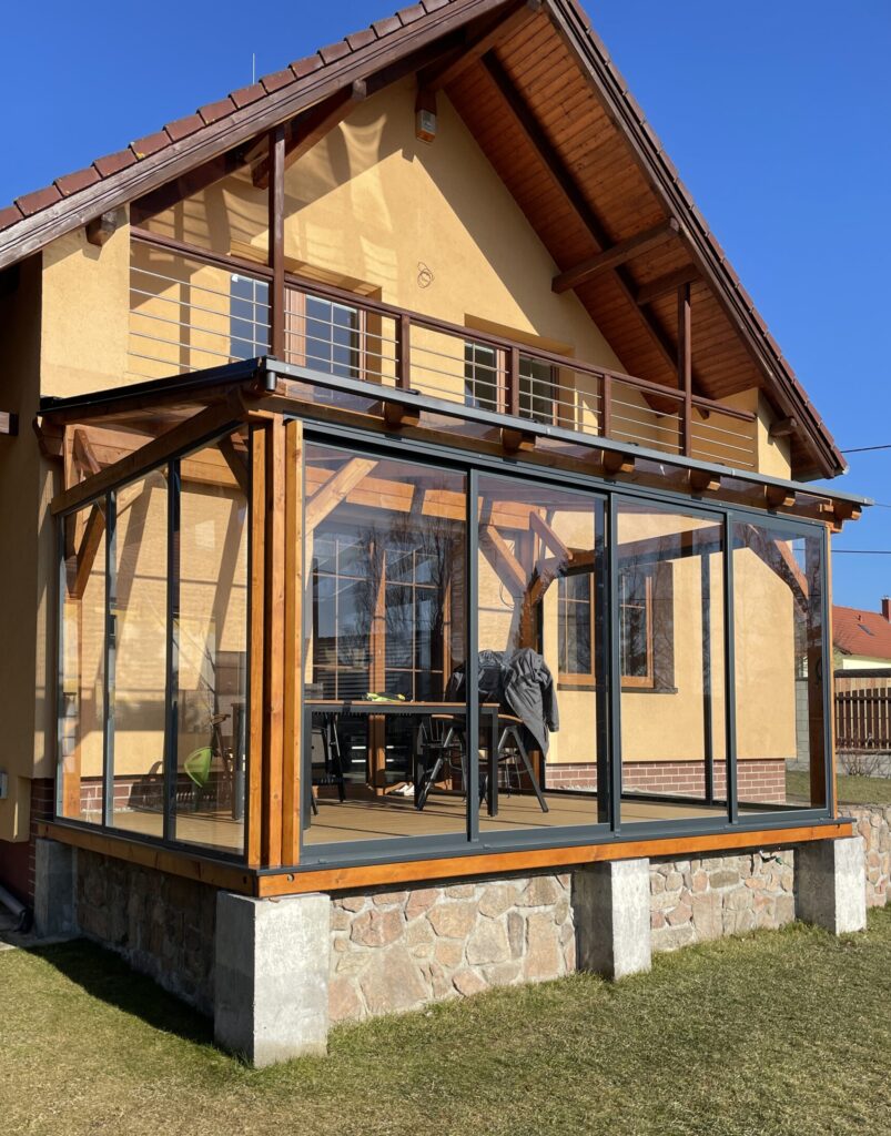 Ukázková realizace, kde vynikne kontrast hliníkového zasklením v barvě antracitu, které je instalováno do stávající lazurou ošetřené dřevěné konstrukce. Tato kombinace patří k nejčastěji vyhledávanému řešení sezónní zimní zahrady. Velké prosklené panely umožňují přímý pohled do zahrady a zároveň vytvoří ochranu proti nečistotám, sněhu a dešti. Při slunečných dnech je možné zasklení otevřít a prostor pod pergolou lehce větrat.