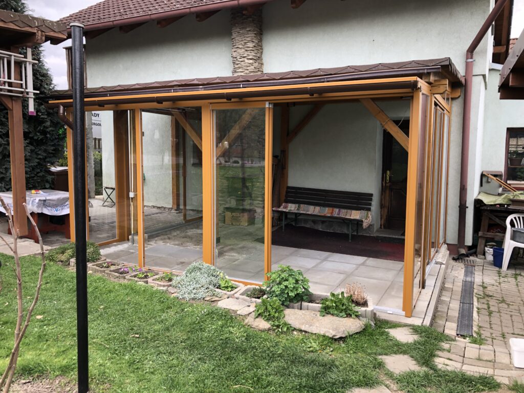 U této zakázky jsme řešili rozšíření stávající dřevěněné pergoly pomocí předsazené hliníkové konstrukce s mléčným PCD 16 mm. Boční zasklení obstarává kombinace posuvného rámového systému PLUS a pevné rámové zasklení FIX. Oba systémy s bezpečnostním kaleným sklem ESG. Všechny hliníkové části jsou lakovány práškovou vypalovanou barvou – komaxit. Na výběr je ze vzorníku RAL.