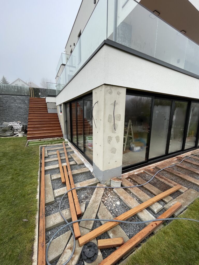 Realizovali jsme rámové izolační zasklení Patio Living Therm, které změnilo původní terasu na plnohodnotný celoroční prostor. Konstrukce dostala elegantní černé lakování a posuvné panely se pohybují po spodní kolejnici s jistotou a lehkostí.
