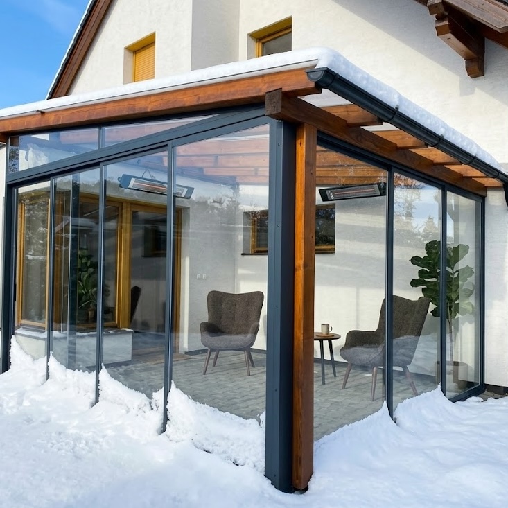 Většina instalací, které provádíme, spadá do kategorie sezónního zasklení. To znamená, že pergola vás ochrání před nepřízní počasí a s pomocí infrazářiče v ní vytvoříte příjemné klima pro odpolední kávu.