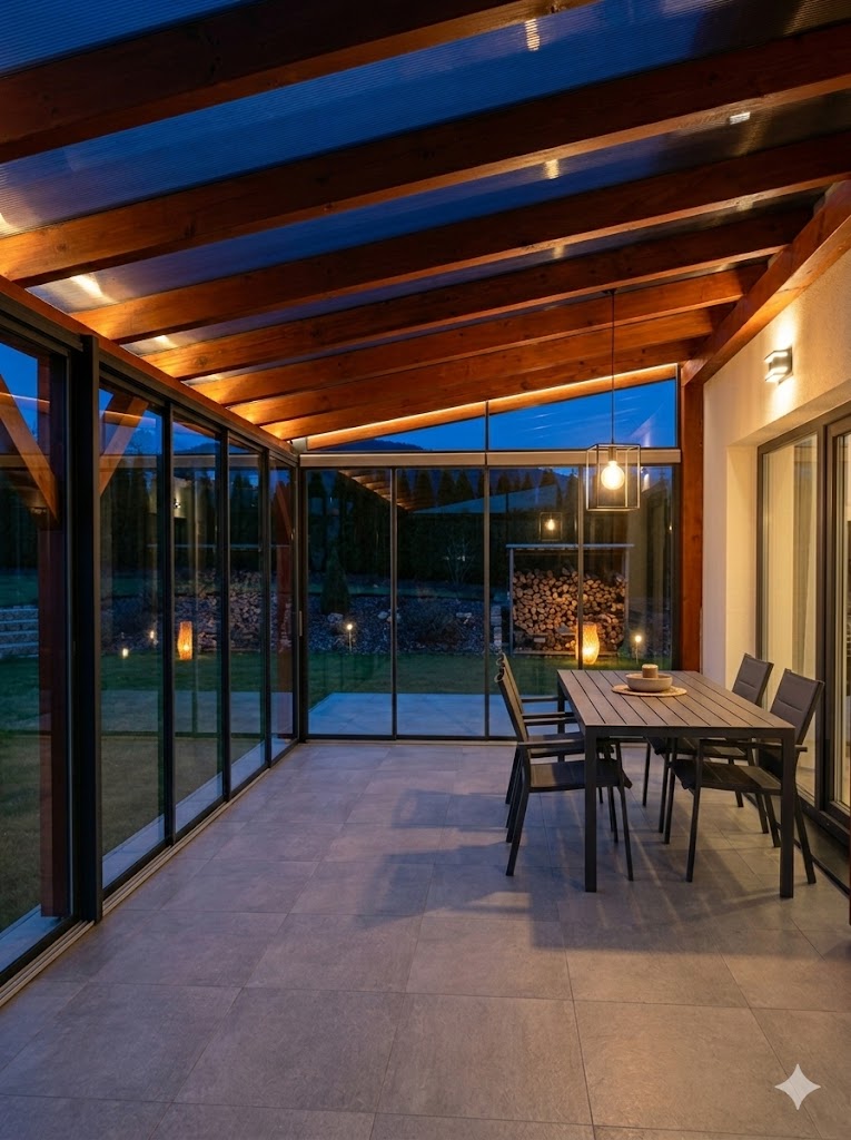 - Izolační dvojskla: Zatímco u sezónních systémů používáme bezpečnostní kalené sklo, celoroční systémy vyžadují izolační dvojskla.