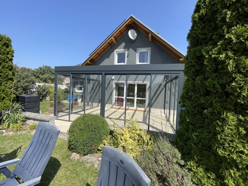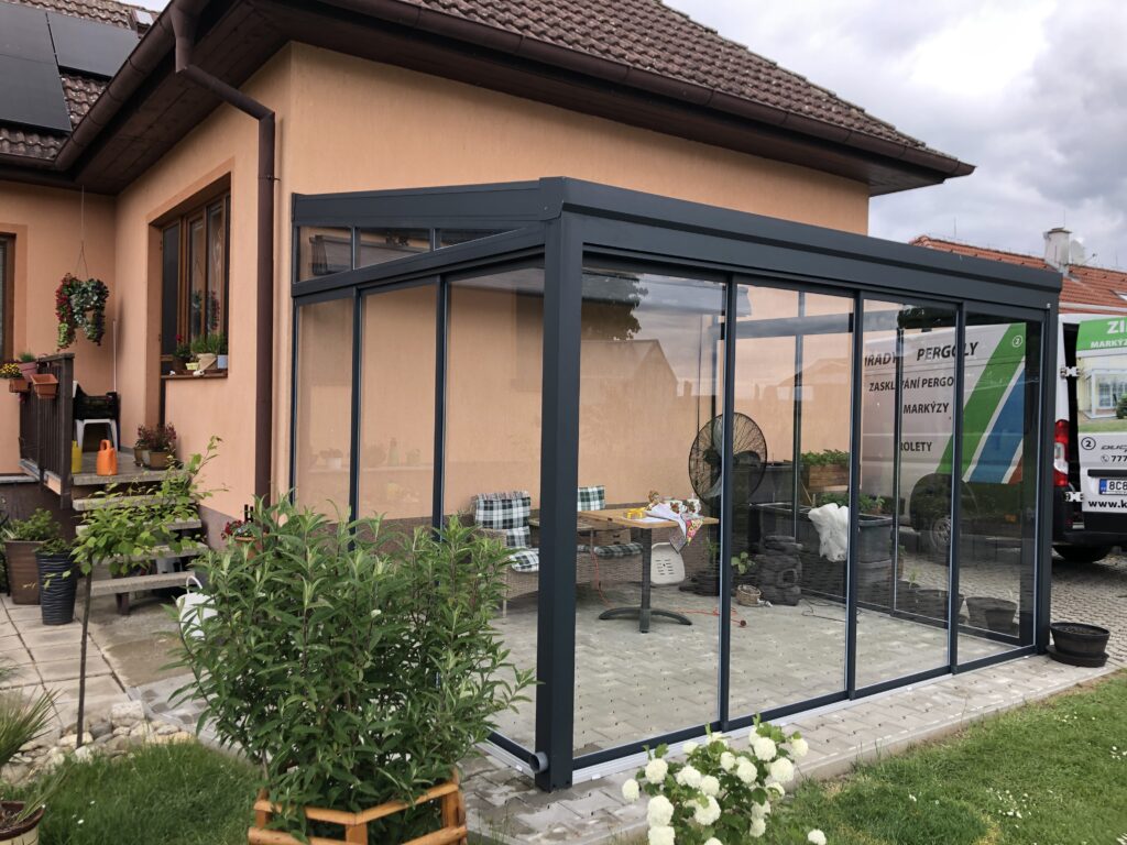 Sezonní zimní zahrada vzniká osazením pergoly bočními posuvnými systémy.
