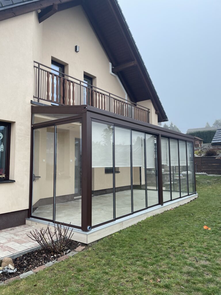 - Rámový systém (Plus a Combi): Využívá hliníkové rámy s výplní o tloušťce 4–8 mm. U 4-dílné varianty se panely zasouvají za sebe, díky čemuž otevřete až 3/4 celé plochy.